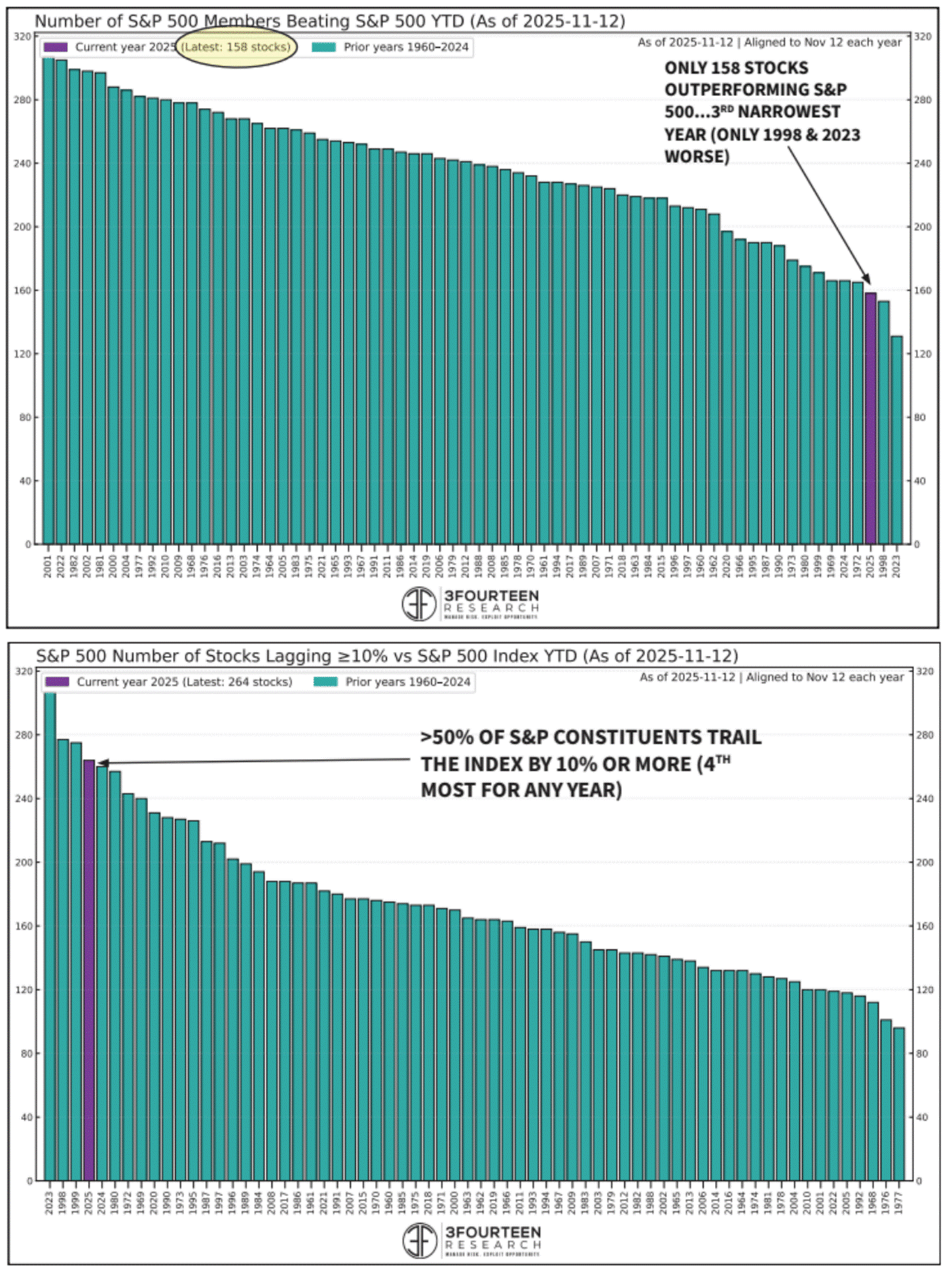 The charts of the week highlight the S&P 500 and how individual companies are performing relative to the index. The top chart displays the number of S&P 500 companies that have outperformed the index each year since 1960. All prior years are shown in teal, while the single purple bar marks the current year, in which only 158 companies have beaten the index, the third-lowest total in the past 65 years, behind only 1998 and 2023. This underscores the growing concentration within the index, where the heavy weighting and strong performance of the largest companies have disproportionately driven returns. The bottom chart reinforces this theme, showing that over half of the index’s companies are lagging the S&P 500 by more than 10%, the fourth-highest reading since 1960. As we’ve noted before, concentration behaves much like leverage: it works wonderfully on the way up, but when momentum reverses, the downside can be sharp. Investors beware.