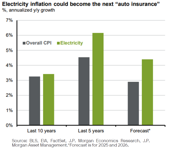 Our chart of the week highlights the growing impact of rising electricity demand on inflation, as measured by the Consumer Price Index (CPI). While the AI-driven data center boom hasn’t directly affected most households, its ripple effects are likely to show up in utility bills. As the chart illustrates, electricity inflation tracked closely with overall CPI for much of the past decade, but over the last five years, it has surged ahead. This acceleration reflects a sharp rise in demand driven by broader electrification and the growing energy needs of AI infrastructure. Traditional data centers have been around for years, but AI facilities consume far more power—a single AI search can require roughly 10 times the energy of a basic web search. If this trajectory persists, electricity could become a structural contributor to inflation, much like auto insurance has in recent years.
