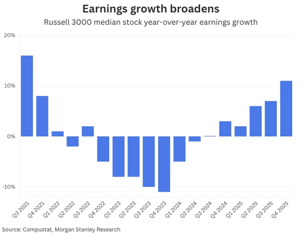 The chart of the week shows earnings growth broadening across the Russell 3000, signaling that market strength is no longer concentrated in just a handful of mega-cap tech and AI stocks. After a period where leaders like NVIDIA carried much of the gains, those names have cooled slightly while other sectors are now picking up the slack. That rotation is constructive, because it points to healthier, more balanced participation across U.S. equities. One thing of note is the median earnings growth reflects how the “typical” stock is performing, whereas the average can be distorted by a few outsized winners or losers. With the median turning positive strongly positive, above 10% earnings growth, the data suggests underlying earnings momentum is improving even as headline tech performance moderates.