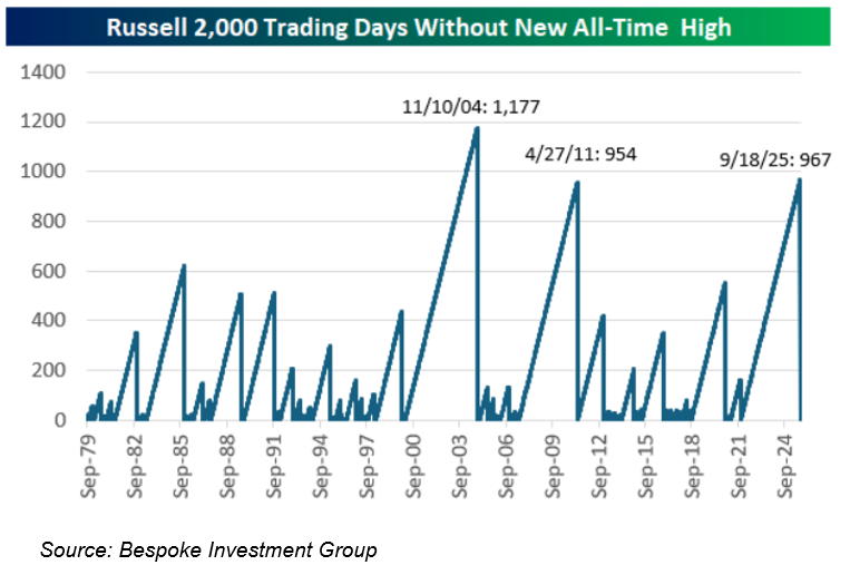 The chart of the week highlights periods when the Russell 2000, an index of U.S. small-cap stocks, went extended stretches without reaching a new all-time high. In September, the index finally broke through to a new high, ending its second-longest streak without one since the 1970s. Small caps posted a strong third quarter, boosted by the Federal Reserve’s September rate cut and growing expectations for additional easing. Rate cuts are particularly supportive for smaller companies, which tend to rely more heavily on debt to finance their operations. Small-cap stocks have faced notable headwinds in the past few years with higher interest rates and less exposure to technology-driven earnings growth, though it’s encouraging to see other areas of the equity market broaden out and participate in new highs.