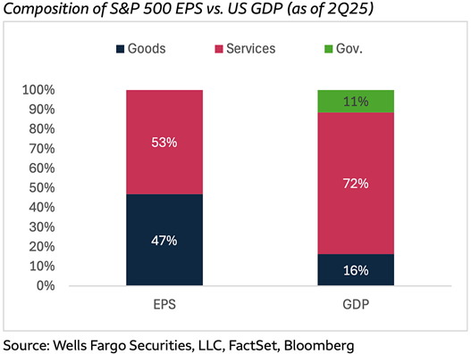 This week’s chart compares the makeup of S&P 500 earnings per share (EPS) with U.S. gross domestic product (GDP). The U.S. economy is predominantly services-oriented, representing over 70% of GDP, but S&P 500 earnings are almost evenly split between services and goods/manufacturing. Given the barrage of negative headlines and dramatic policy changes thus far in 2025, many are surprised to see yet another double-digit gain for large-cap U.S. equities as we round out the first three quarters of this calendar year. A good reminder that while the U.S. stock market and the U.S. economy are closely intertwined, they’re not necessarily the same.